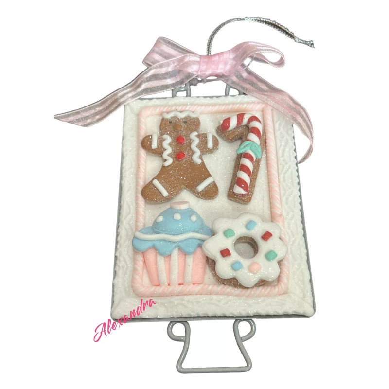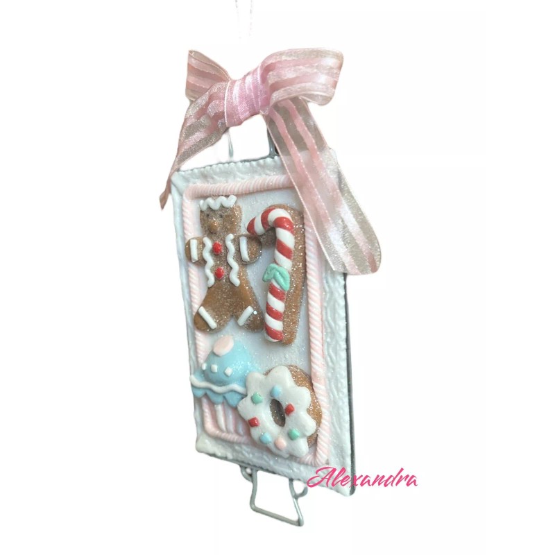 Add some sweetness to your Christmas tree with this adorable sweets on baking tray frosted gingerbread cookie ornament. Perfect for those who love shabby chic style, this ornament is made of mixed materials and has a candyland theme.