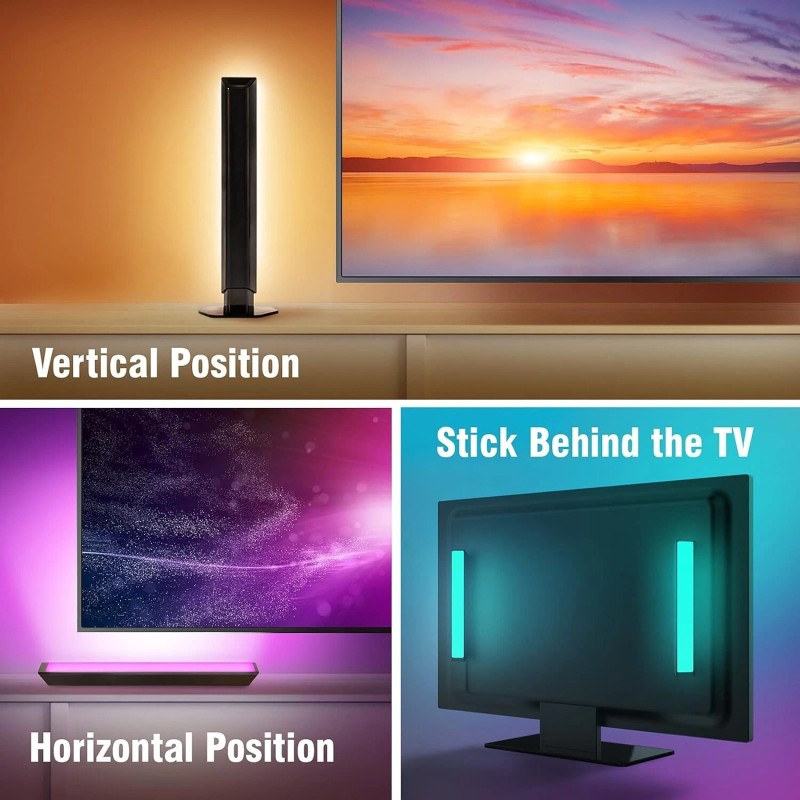 Enhance TV/Movie/Sports/Gaming experiences with the Smart Wi-Fi LED Multicolor Light Bars. Sleek and stylish light bars can be mounted to flat surfaces or stand in various directions. Control your lights in multiple ways – On/Off, dimming, color change, color temperature change, schedule, scene setting. Dynamic audio-sync with built-in micro for movie mode, game mode, music mode and more. Voice control using Alexa or Google Assistant.
