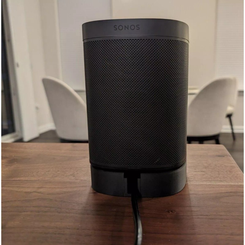 Created from a desire to hide that pesky power cable when placing my Sonos One on the table behind my sofa, I decided to design a simple yet elegant way to reroute the power cable to come out the front of the speaker rather than the rear. Printed with high quality Matte PLA to compliment the original color of the speaker wonderfully. Black rubber feet inset into the model to provide a nonslip, no-rattle base. The angle of the bend is such that it does not strain your power cable. Simply rock your speaker on to the base and enjoy!
