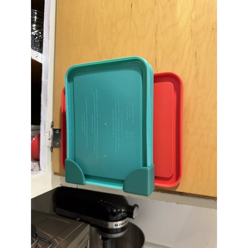 Unbranded Space-saving Pyrex lid organizer for cabinet doors. Holds 3 lids. 3D printed PLA