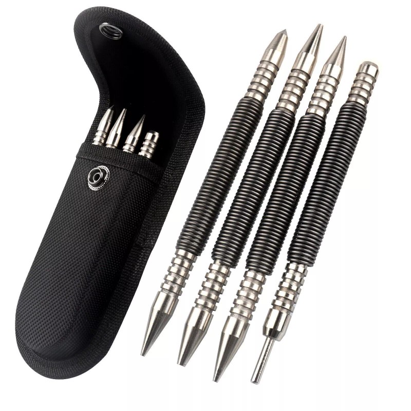 (2) Dual head center punch and nail setter: can be used on any sufface (either wood or metal) and the powerful impact allows it to punch perfectly centered, highly visible marks on the surface.