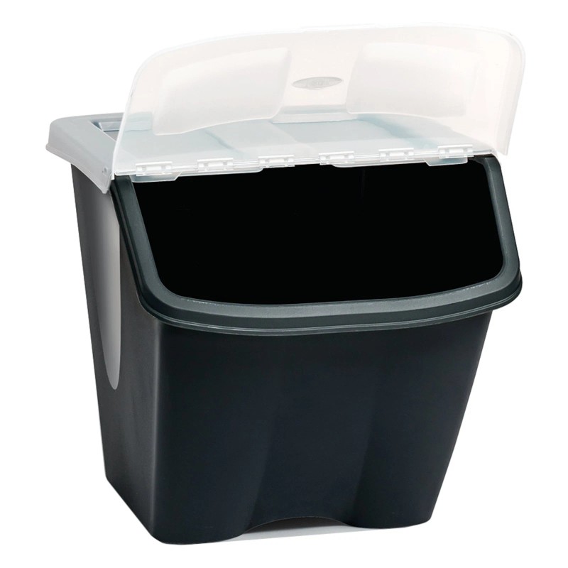 The line stackable recycle bin includes an angled stay-open hands-free front facing lid. Perfect for use as a waste, recycle collection, or bird feed container. Also a great dry pet food storage. Use for an array of storage solutions (dry goods, garage, pantry, pet food, bird seed, recyclables, and much more). Made of durable BPA Free polypropylene plastic and delivers 10 gallon dry volume capacity. The base color is charcoal black with a clear front flip lid for easy front hopper style access. Purchase multiple units for a complete stackable storage system.