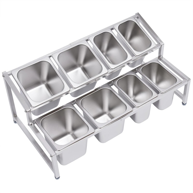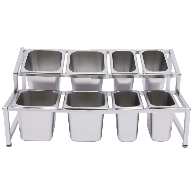 Specification Shelf Material: 304 Stainless Steel Pan Material: 201 Stainless Steel Color: Silver Installation Type: Freestanding Process: Polished, Electrolysis Special Feature: Expandable Spice Rack Number of Tiers: 2 Number of Shelves: 1 Food Pan Quantity: 4 x 1/9 Pans + 4 x 1/6 Pans |