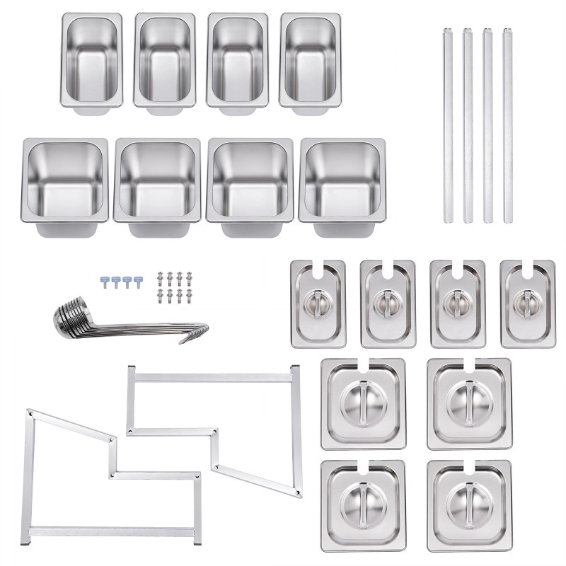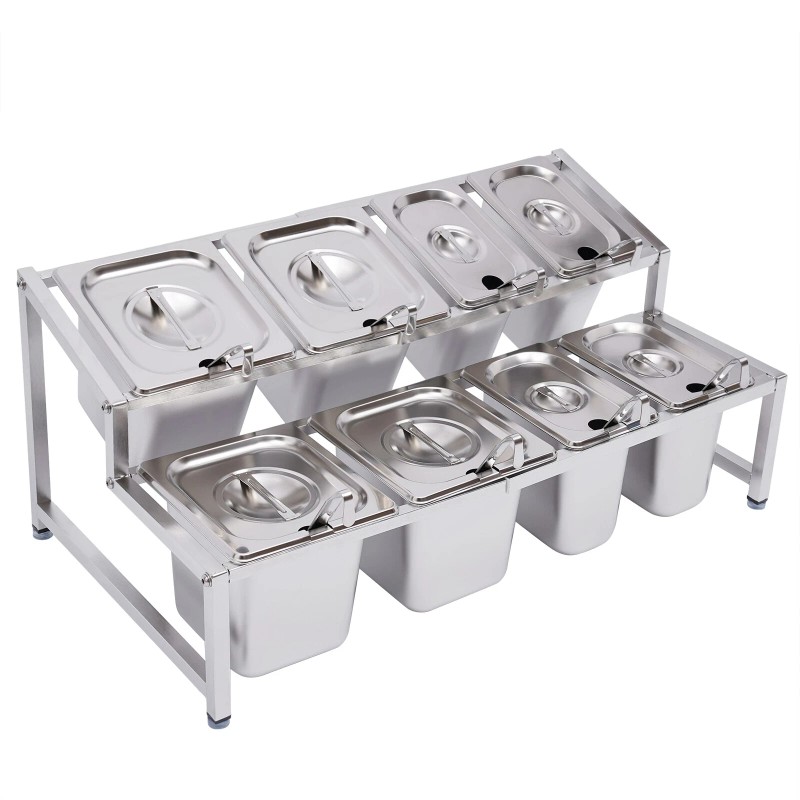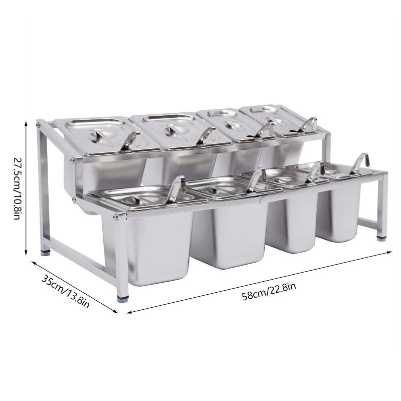 Specification Shelf Material: 304 Stainless Steel Pan Material: 201 Stainless Steel Color: Silver Installation Type: Freestanding Process: Polished, Electrolysis Special Feature: Expandable Spice Rack Number of Tiers: 2 Number of Shelves: 1 Food Pan Quantity: 4 x 1/9 Pans + 4 x 1/6 Pans | ![]() |