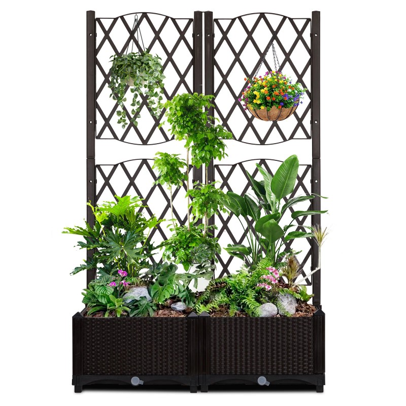 Enjoy a beautiful, organized, and thriving garden with this versatile and stylish trellis planter. Perfect for vine plants, flowers, or lush greenery, it brings both elegance and practicality to any space! This freestanding garden bed is constructed from premium UV-resistant wicker, designed to withstand the elements while offering durability and style. With a built-in trellis, it provides essential support for climbing plants, flowers, or lush greenery, transforming your patio, balcony, or garden into a stunning floral oasis. Its thoughtfully designed planter box features built-in drainage holes for optimal plant health, preventing waterlogging and ensuring your plants thrive.