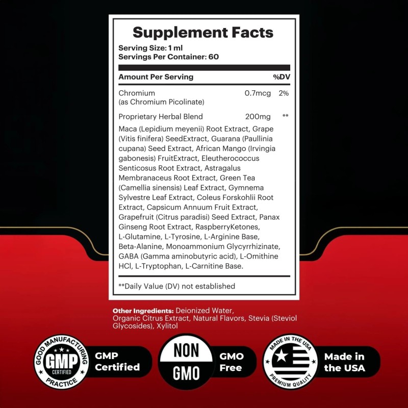 Each 1 ml serving contains chromium picolinate along with a proprietary blend of 20+ carefully chosen ingredients such as maca root extract, grape seed extract, guarana, green tea, gymnema sylvestre, raspberry ketones, and more. These ingredients are traditionally used for their nutritional value and are combined here in a convenient liquid format that’s easy to take each day.