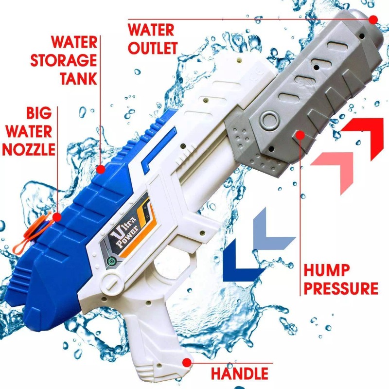 guns for kids hold up to 10 OZ Water and shooting range of 25ft.