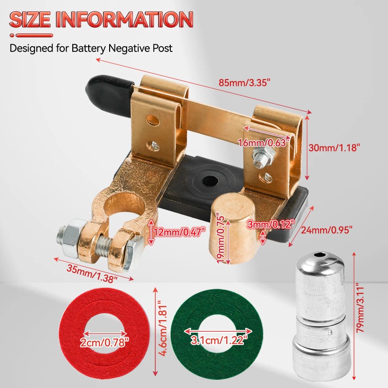 Compatible: used for top post terminal, 15-17 mm cone / tapering battery NEGATIVE post only, DC 12V-24V system, 200A continuous and 600A momentary at DC 12V, on/off 2 position.