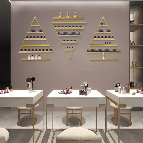 This Is a Wall-mounted Nail Polish Display Rack That Can Help You Achieve Both Decorative and Storage Functions. Its Solid Triangular Structure and Thickened and Widened Iron Shelves Can Easily Store and Display Nail Polish, Cosmetics, and More. the Smooth Lines and Shiny Metallic Sheen Bring Stylish and Elegant Style to Your Walls.
