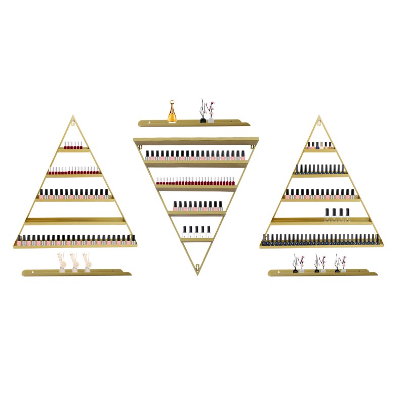 This Is a Wall-mounted Nail Polish Display Rack That Can Help You Achieve Both Decorative and Storage Functions. Its Solid Triangular Structure and Thickened and Widened Iron Shelves Can Easily Store and Display Nail Polish, Cosmetics, and More. the Smooth Lines and Shiny Metallic Sheen Bring Stylish and Elegant Style to Your Walls.