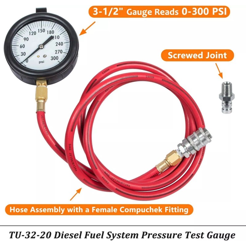 【Package Includes】Consists of a hose assembly with a female Compuchek fitting on one end and a 3-1/2", 300 PSI gauge on the other.