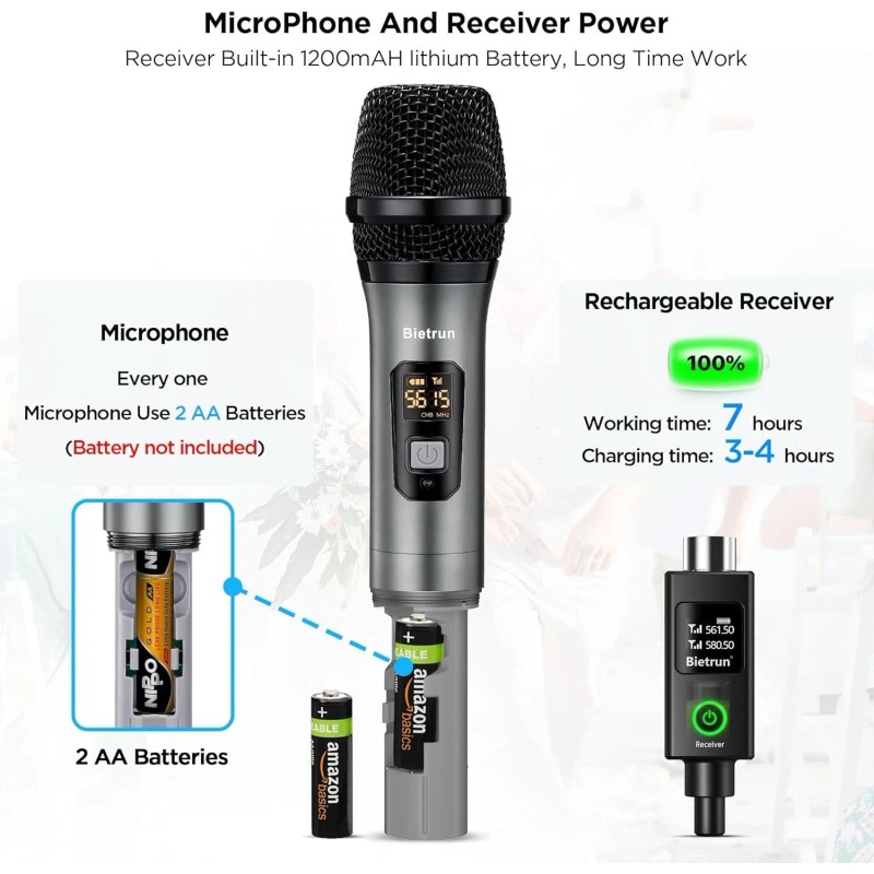 • No batteries required for microphones; we recommend 2 AA Amazon alkaline batteries.