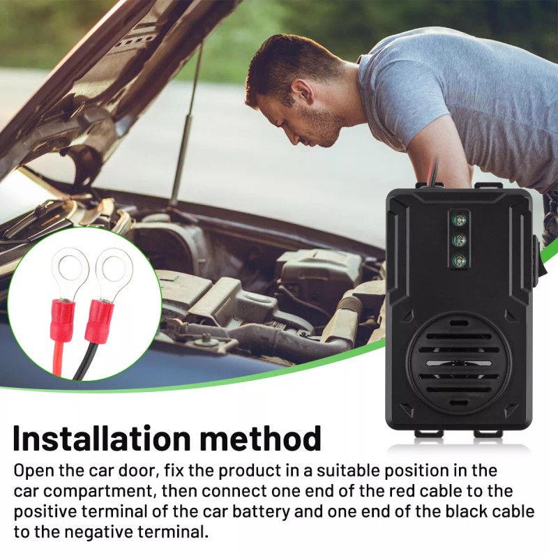 Installation method: Open the car door, fix the product in the appropriate position inside the carriage, and then connect one end of the red cable to the positive pole of the car battery and one end of the black cable to the negative pole.