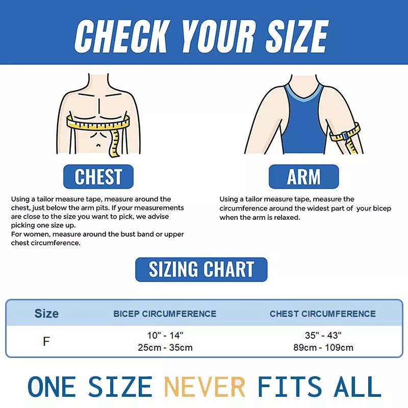 - One size fits most: 35-43 inch chest, 10-14 inch bicep (Adjustable velcro)