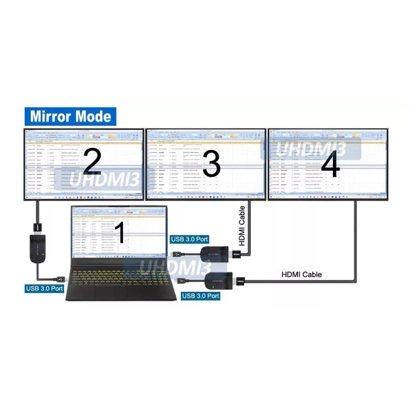 - Mirror/Clone mode will duplicate the PC screen onto additional monitor(s) connected through this USB to HDMI adapter for simultaneous displays of the same PC screen.