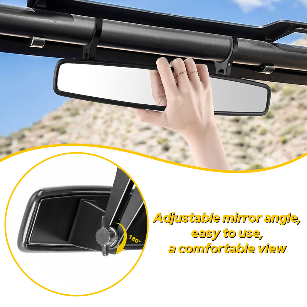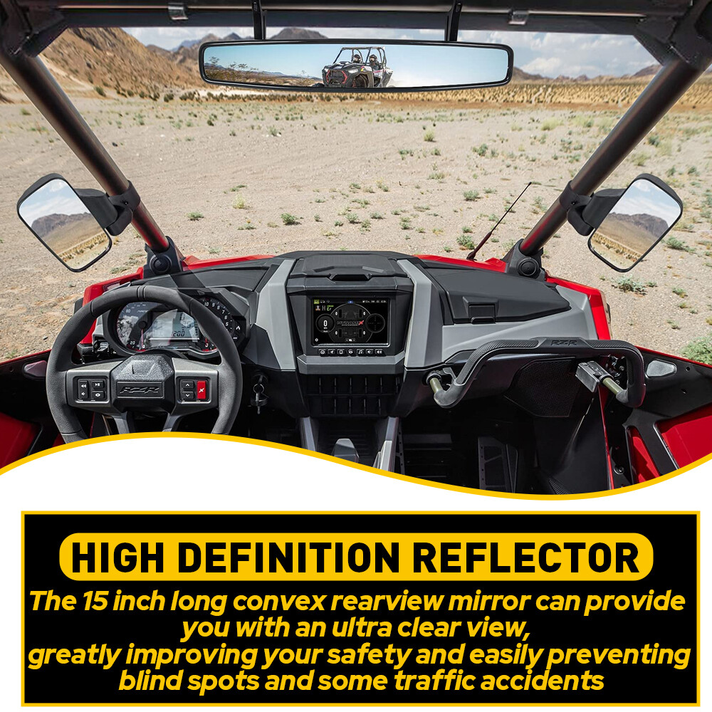 *HD The real glass lens of an HD UTV mirror can provide you with super clear images and reduce blind spots to ensure your driving safety. *Broaden your vision A 15 "long convex rear view mirror offers you wide vision to prevent some traffic accidents and greatly improve your safety. *Adjustment The bracket with stable installations provides 3 adjustment methods to adjust the best rearview angle, which is resistant to friction and corrosion. *Shatterproof glass There is an explosion-proof film on the back of our mirror, it can prevent broken glass from hurting people. The high-impact ABS housing frame wraps tightly around the rear-view mirror for better wind and shock protection when driving or racing on rough roads. *Unlimited thrill driving The case of the glass lens is tight enough to protect against wind and shock, scratch, and fall when driving on rough roads, perfect for most Polaris and UTVs. *Easy installation The clamp with horseshoe design is easy to install and remove without fastening bolts.