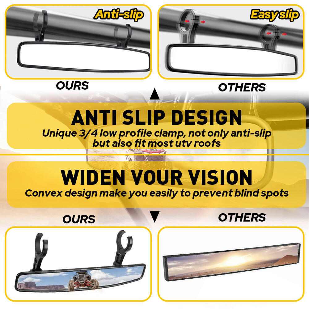 The real glass lens of an HD UTV mirror can provide you with super clear images and reduce blind spots to ensure your driving safety.