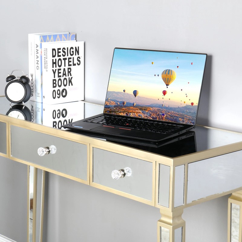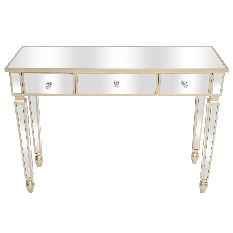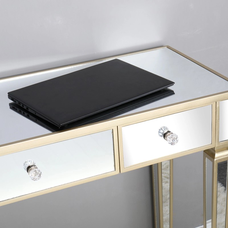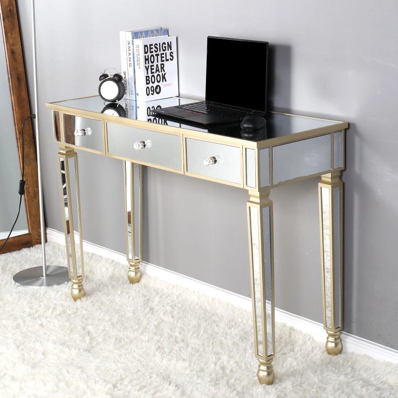 This is our Three Drawers Mirror Table Dressing Table Console Table, which has a beautiful appearance. It is perfect for any room, this mirrored makeup table will glamorously complement your home. With its mirrored finish, it adapts to any surroundings without overpowering yet, catches your eye with its unique presence. Shimmering mirror reflects across the composition. The practical size and function works as well in the living room as it does in the bedroom. Do not hesitate to buy one!