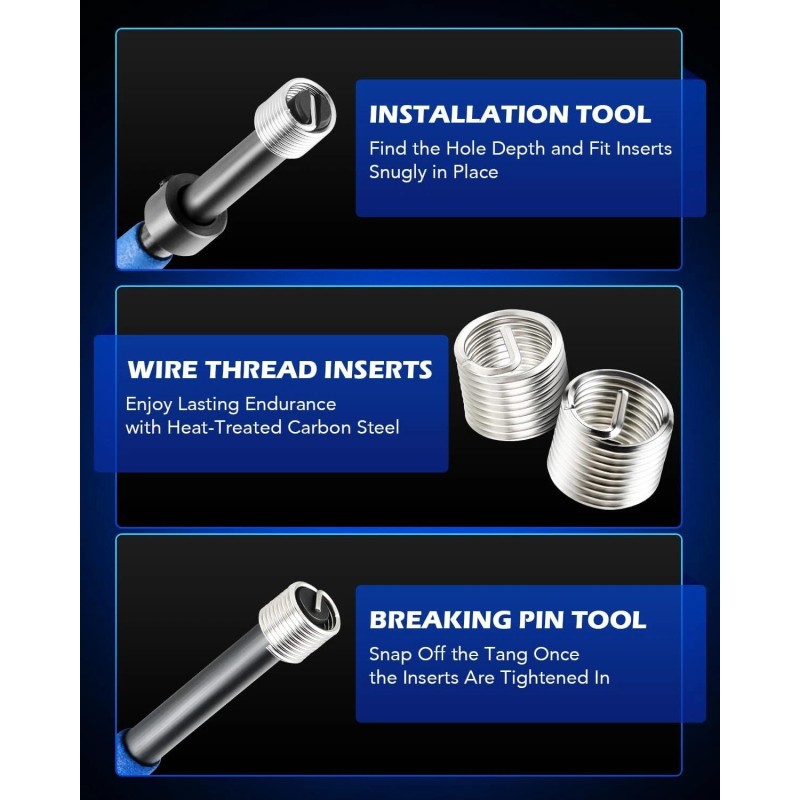 - Includes 15 thread inserts, installation and breaking tools, a precision screw tap, drill bit, and hex wrench for complete functionality.