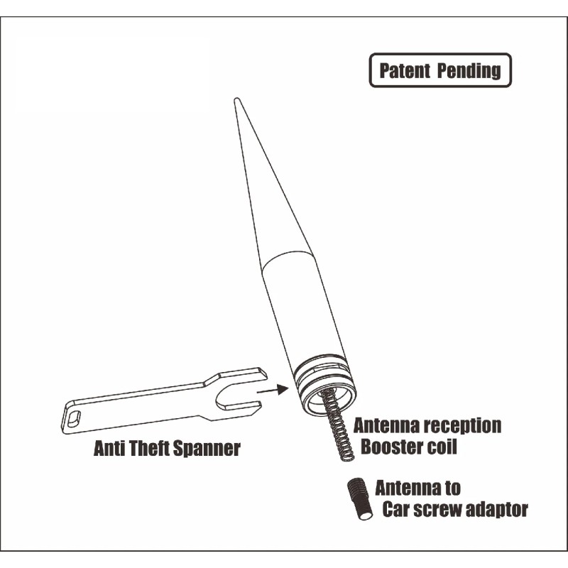All VMS Racing Bullet Antennas now feature a Patent Pending ANTI-THEFT Design which includes a special Spanner Key that allows you to tight in the antenna to a point which is almost impossible to remove with your bare hands or any other commonly available tool without damaging the antenna. Also included is a Patent Pending Internal Copper Booster Coil That Improves radio signal