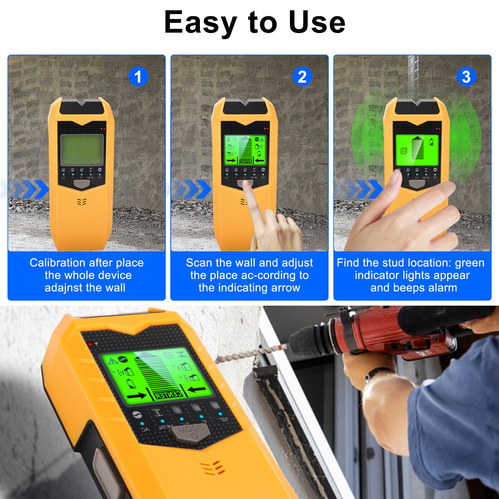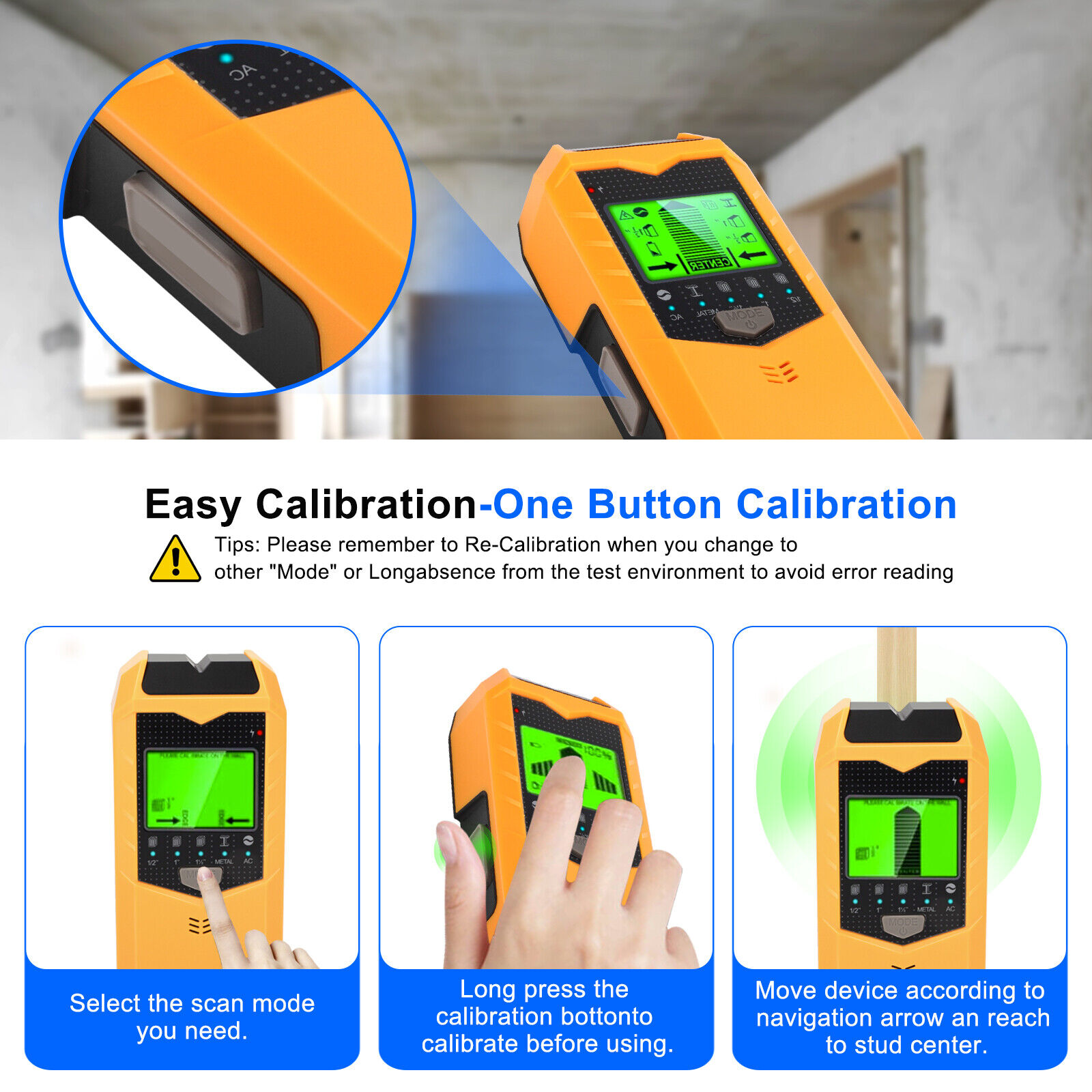 Ensure perfect accuracy with simple calibration before each use. Press the Scan button for calibration, and once the bars disappear and the buzzer beeps, calibration is complete. Keep the tool flat against the wall, avoiding rocking, tilting, or pressing hard while scanning. The stud finder will beep once the edge of the stud is detected.