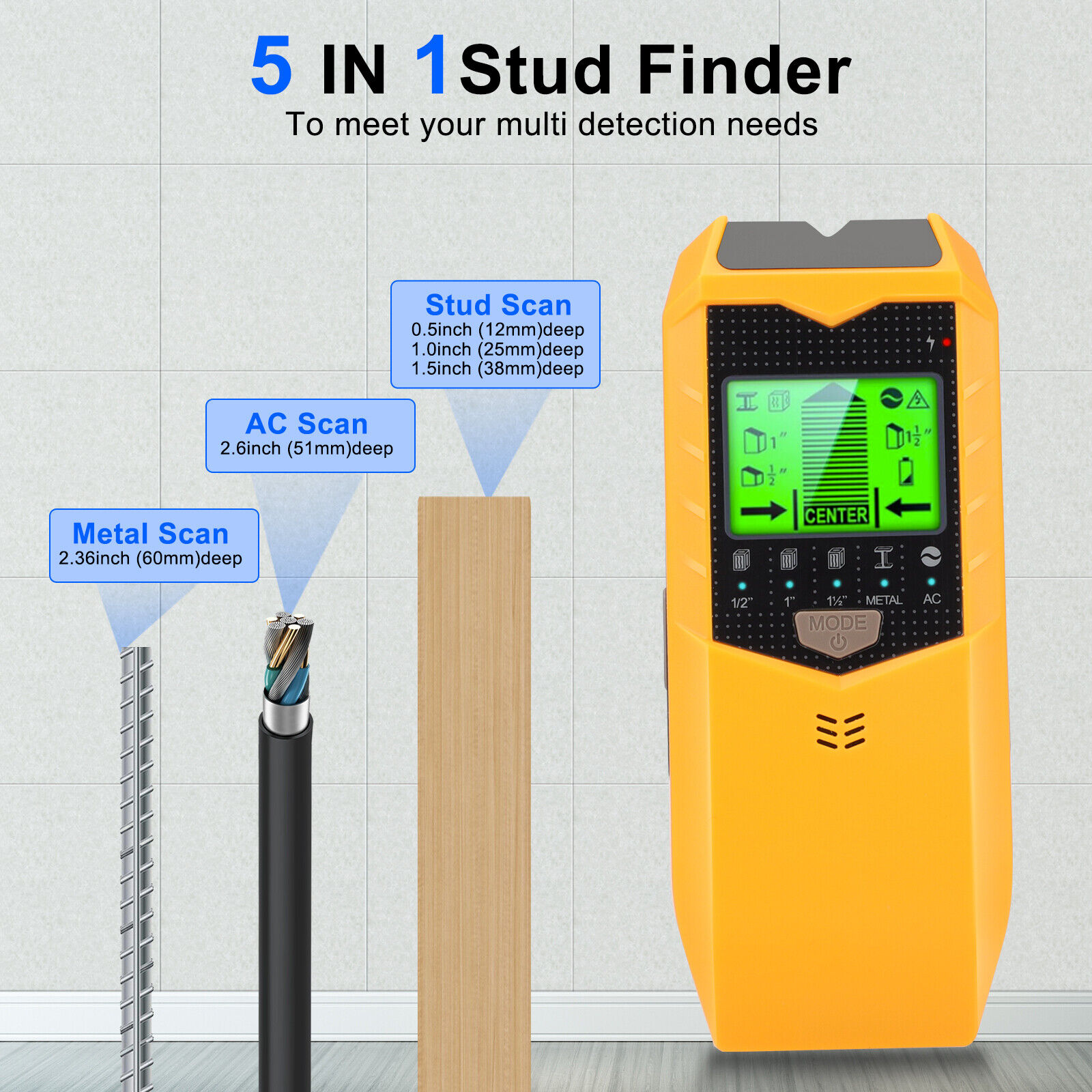 Equipped with high-quality sensors and a shock-resistant, dust-resistant body, this wood/metal stud finder offers durability and longevity. It features five scanning modes for different wall material thicknesses, including 1/2 inch, 1 inch, and 1.5-inch deep scans, metal detection up to 2.36 inches, and live unshielded AC wire detection up to 2 inches deep.