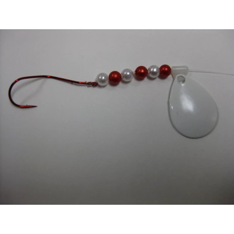 You are buying a White Slow Death hook spinner rig. All rigs are made with 10lb. monofilament line and are approx. 48 in. long. They are all made with a red #2 slow death hook and a #12 swivel to prevent line twist. All rigs are made with a #3 Colorado spinner blade and a quick change clevis.