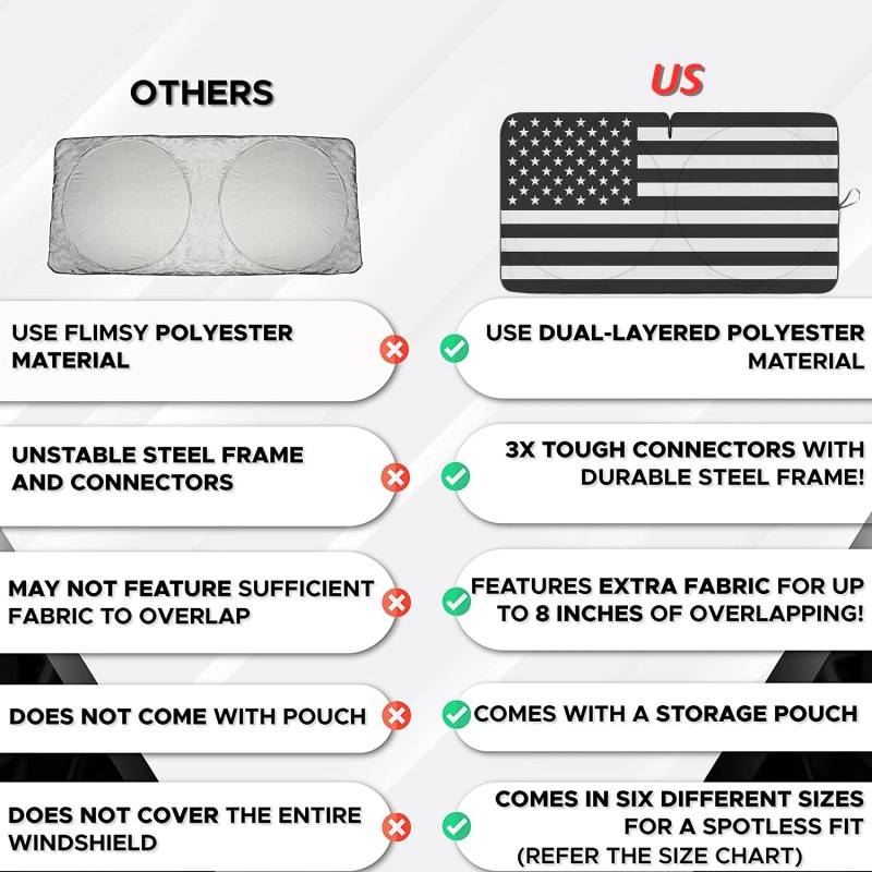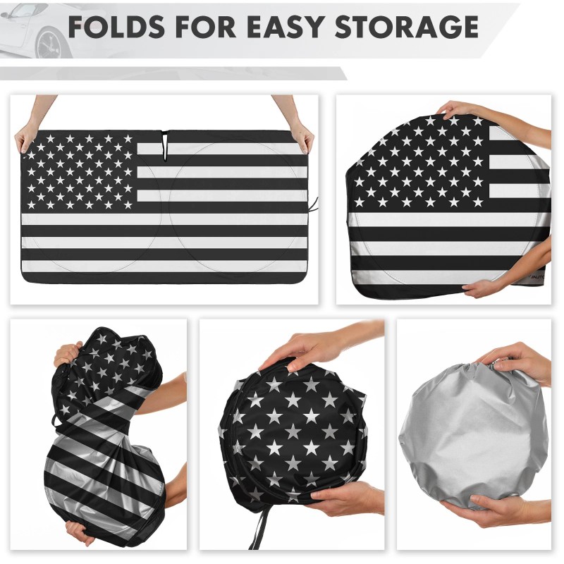 American flag design - The American windshield visor combines powerful sunlight reflection and heat insulation.The unique design makes your car unique in the sun. Get rid of harmful ultraviolet radiation to your car.
