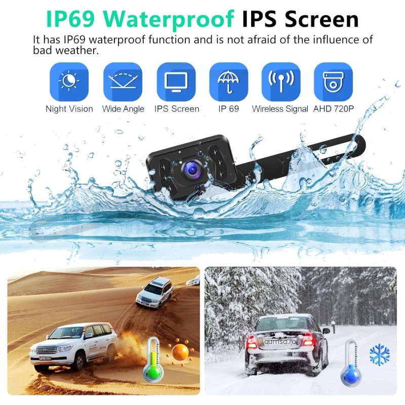 - With IP69 waterproof design, you can clearly see the road conditions even in rain/snow/dog days. No need to worry about water or fog penetrating the lens, this license plate reversing camera can still work in rainy weather, providing clear images without noticeable delay, ensuring your driving safety!