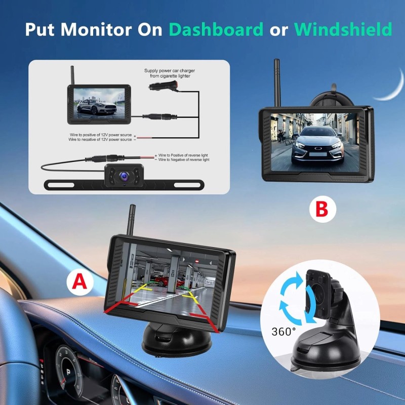 - Transmits real real-time video feed, maintains original colors, and uses advanced optical design and superior image processing technology to provide high-resolution images of your vehicle. The high-definition 4.3-inch IPS display monitor comes with a suction cup mount that allows the monitor to be mounted on the dashboard or windshield. Note some dashboard material may be less than ideal - windshield is preferred depending on dash texture.