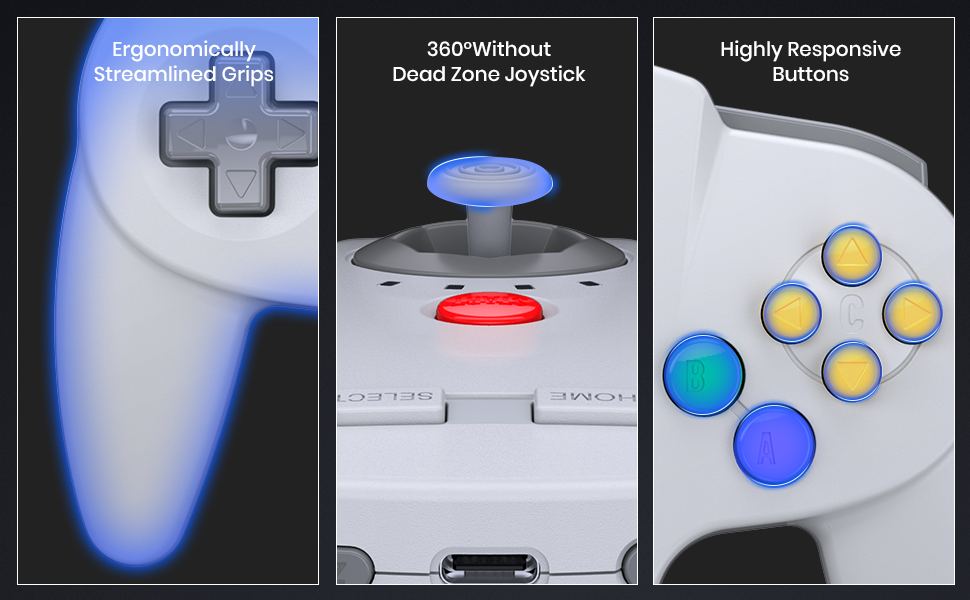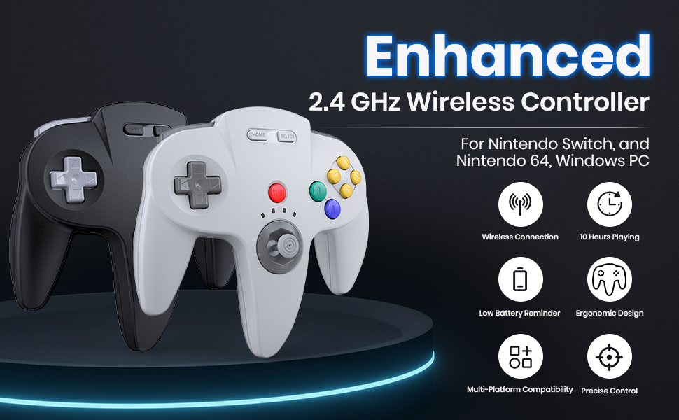 2.4GHz Wireless technology2.4 GHz wireless connection with up to a 25-foot that is better than having to sit on floor a foot away from the TV. Classic N64 style with "M" shape, bring you real old school retro feels |