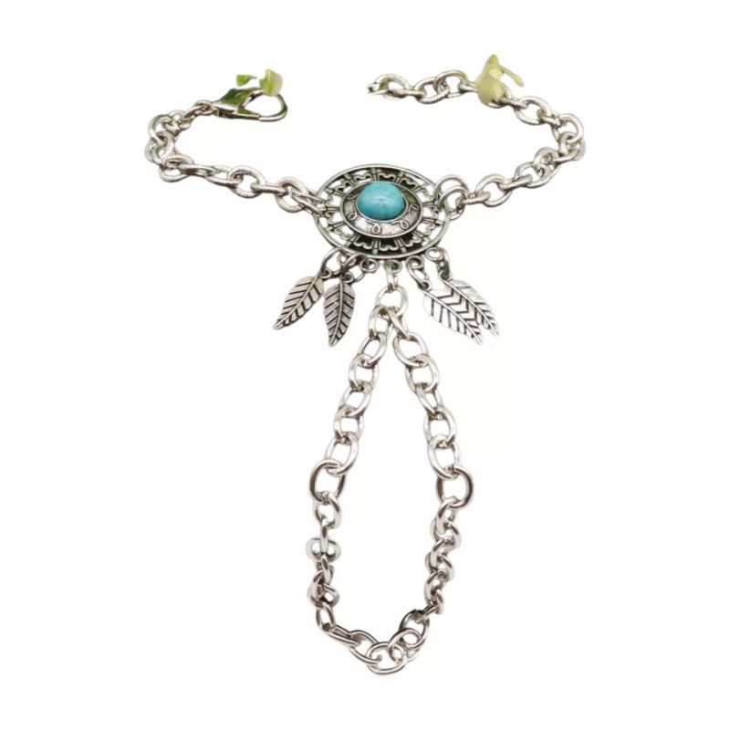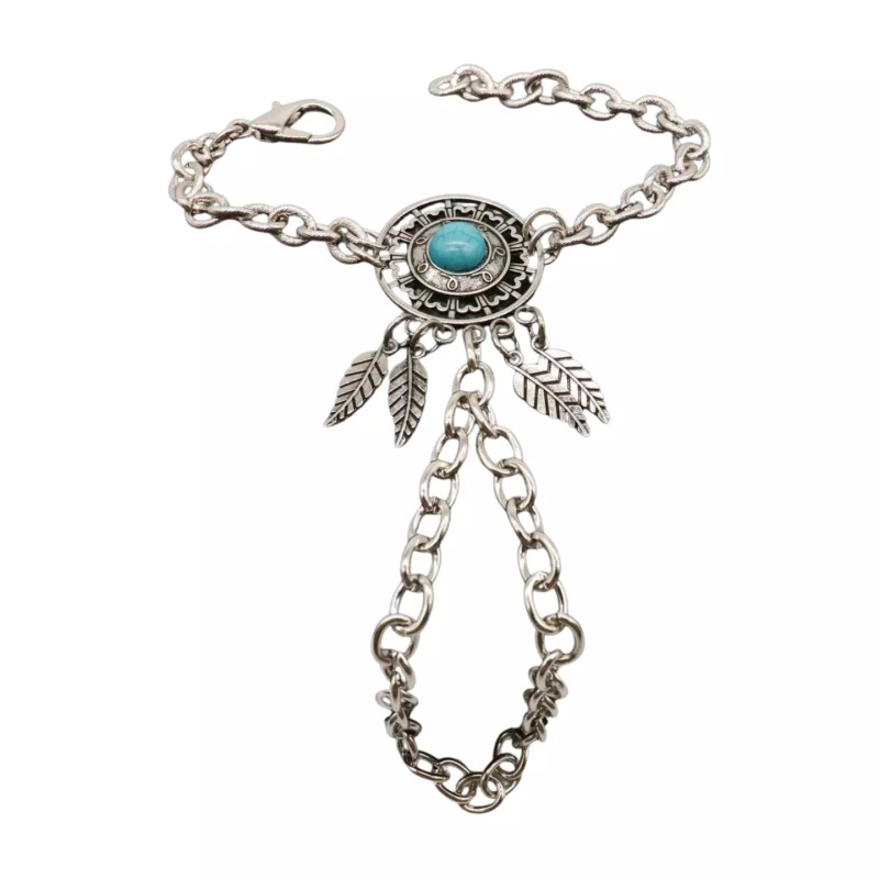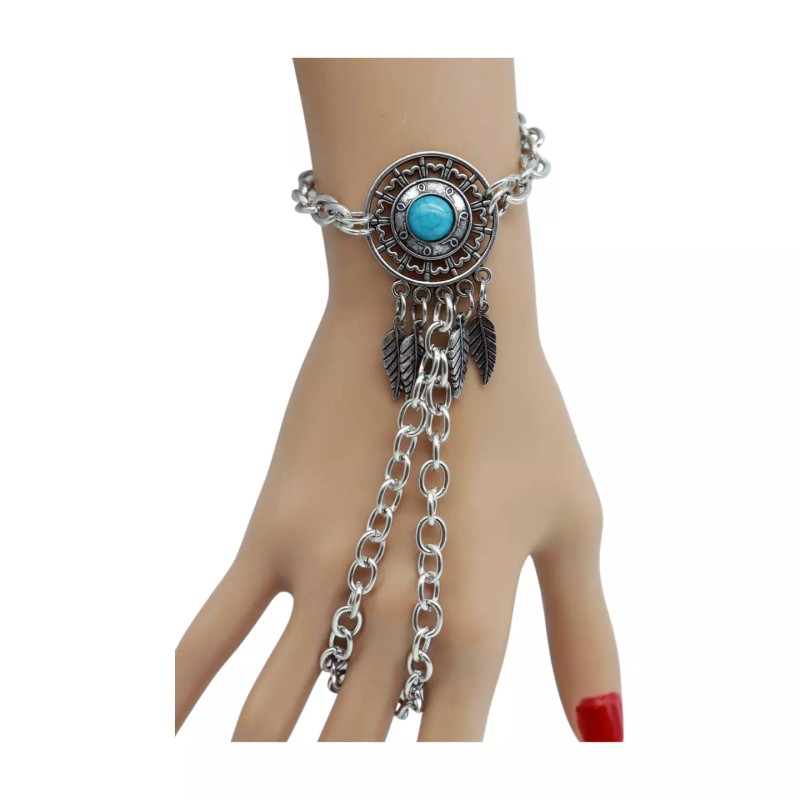 Unbranded Women Silver Metal Hand Chain Bling Bracelet Connected Ring Turquoise Blue Beads