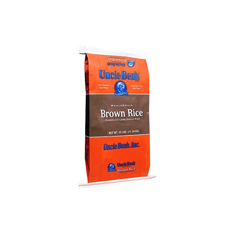 Uncle BENs whole grain brown rice, 25 pound -- 1 each. The ideal response to Patron demands for whole-grain, lower-carb offerings, this economical brown rice is always fluffy, never sticky, and cooks to perfection in just 25 minutes. A natural source of fiber, b-vitamins, and iron to support a healthy heart.