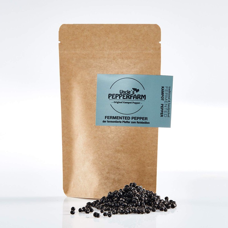 Uncle's Pepperfarm Fermented Kampot Pepper - Whole Peppercorns Pickled in Sea Salt - Aroma Protection Bag, 50 g