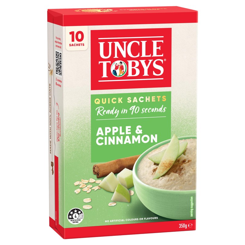 • Uncle Tobys Apple & Cinnamon Quick Sachets are made from 100 percentage Australian wholegrain oats, juicy apple with a hint of cinammon