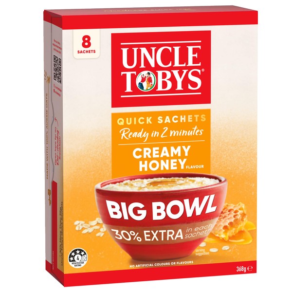 UNCLE TOBYS Oats Quick Sachets Honey, Big Bowl 30 Percent Extra, 8 Sachets