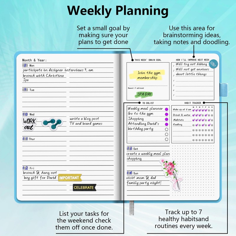 - 📙📙UNDATED DAILY WEEKLY PLANNER, Start Anytime: The planner features UNDATED, unlike other dated planners, you can start planning your task/goals at any time throughout the year without wasting any pages, allowing flexibility without guilt. Our planner notebook stay focused of day, week, and month organized.