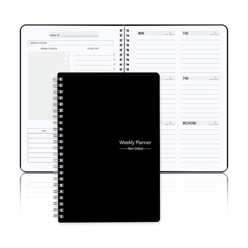 Undated Weekly Planner, Weekly Goals Notebook, A5 To Do List Planner, Habit Tracker Journal with Spiral Binding, 5.7 x 8.0 in, Black