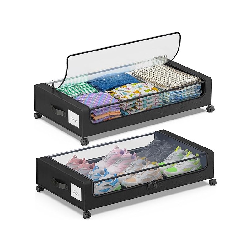Under Bed Storage with Wheels, 2-Pack Under Bed Storage Containers with Clear Lids, XXL 60L Under the bed storage Organizer Bins, Rolling Under Bed Metal Drawer for Clothes,Shoes,Toys (Black, 2 Pack)