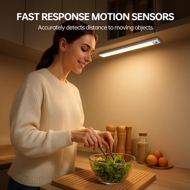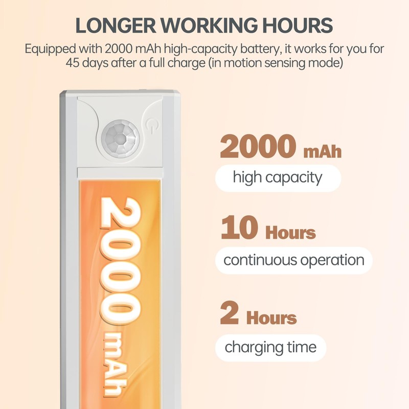 - LONG-LASTING RECHARGEABLE BATTERY: Equipped with a 2000mAh rechargeable battery, our under cabinet light offers extended usage without the need for constant recharging. In motion sensor mode, a full charge can last up to 45 days, ensuring reliable illumination for weeks. Recharge conveniently via USB-C without the hassle of replacing batteries or dealing with wiring.