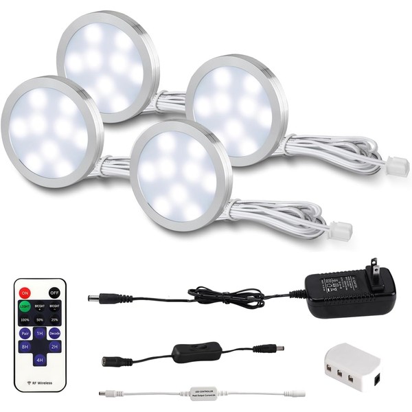 Under Cabinet Puck Lights with Remote, 4 Pack Puck Light Wired, Under Counter Light Fixtures for Kitchen, LED Cabinet Lighting for Shelf, Display Case (6000K, Cold White)