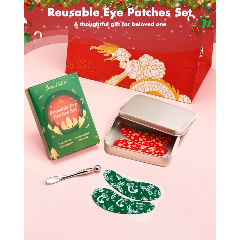 Under Eye Patches Silicone - 2 Pairs Reusable Eye Patches, Eye Wrinkle Patches, Reusable Under Eye Mask, Plump Fine Lines & Wrinkles, with Metal Eye Cream Applicator, Tin Case, Christmas Red & Green