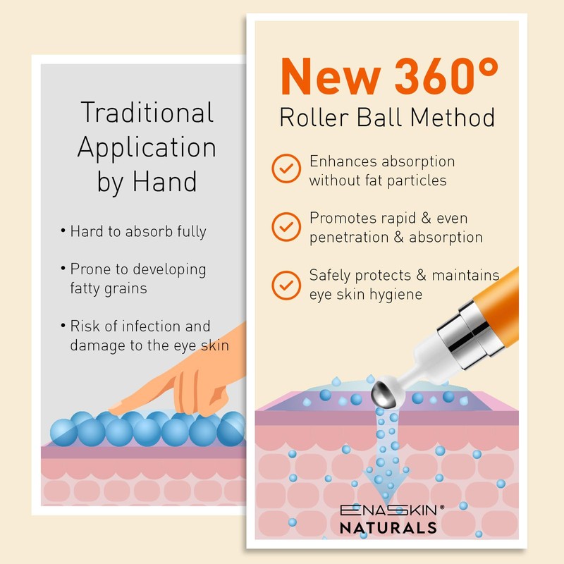 - 360° EYE MASSAGER ROLLER: Our eye cream applicator comes with dual ends designed for applying cream and massaging, boosting absorption. The 360° cooling stainless steel roller-ball in our puffy eyes treatment, especially potent with our caffeine eye serum, ensures uniform application and delivers a revitalizing massage, targeting puffy eyes and dark circles simultaneously.