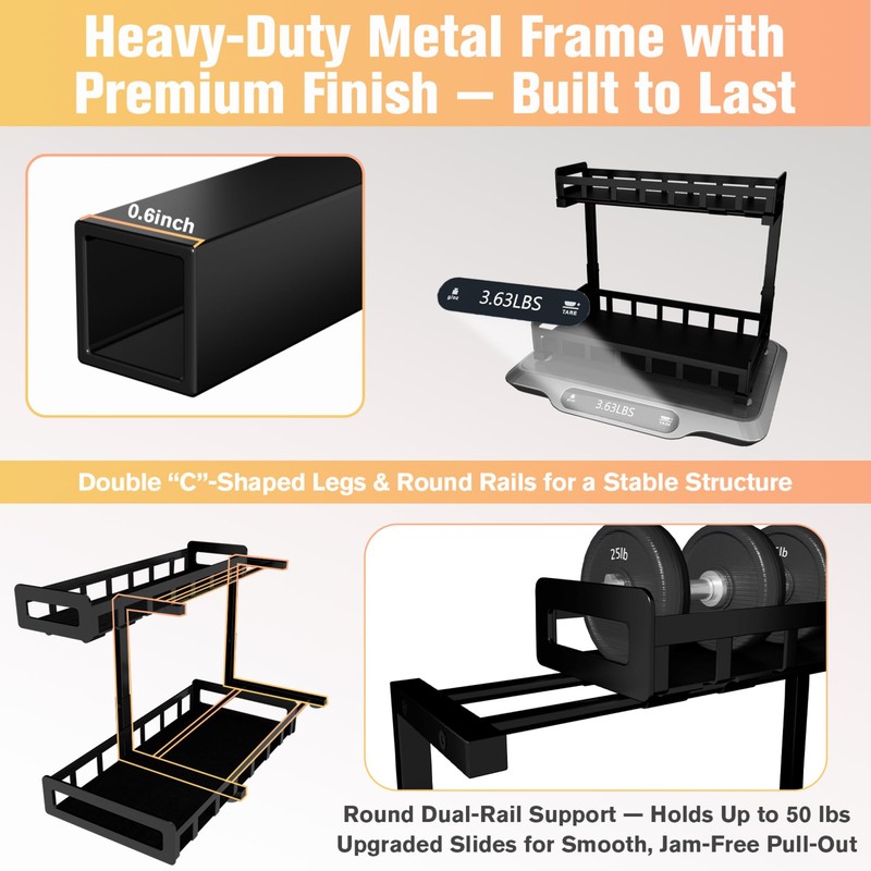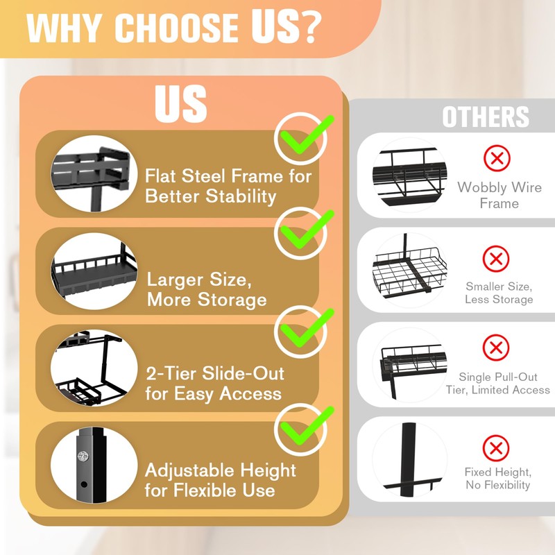 - Adjustable for a Perfect Fit – Multiple height settings adapt to different cabinet spaces, avoiding plumbing pipes or garbage disposals while keeping maximum storage capacity.
