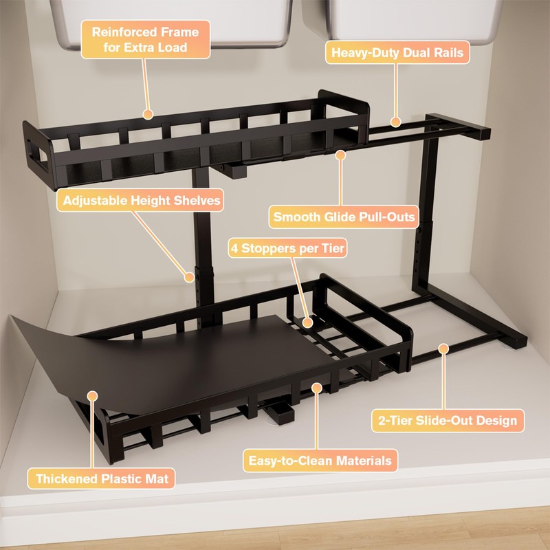 - Maximize Cabinet Space – Large 2-tier design creates extra vertical storage under your sink, perfect for tall spray bottles, cleaning supplies, and toiletries. Keep every corner organized and clutter-free.