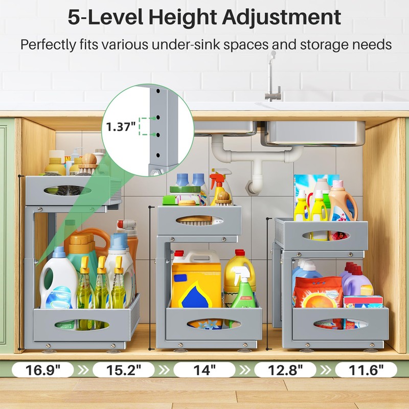 - Upgraded Height Adjustable: This under sink organizers and storage features 5 adjustable levels (from 11.6" to 16.9"), making it perfect for various storage needs and compatible with different cabinet sizes. It helps keep your items neatly organized and maximizes under-sink space