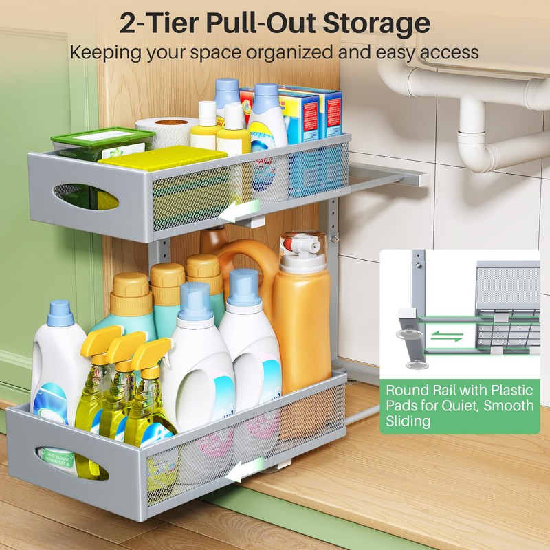 - 2-Tier Mesh Sliding Drawers: The under sink organizer feature upgraded round rails with plastic pads for a smooth, quiet sliding experience—no metal-on-metal noise. Both upper and lower drawers slide out effortlessly, making it easy to access items stored deep in your lower cabinet