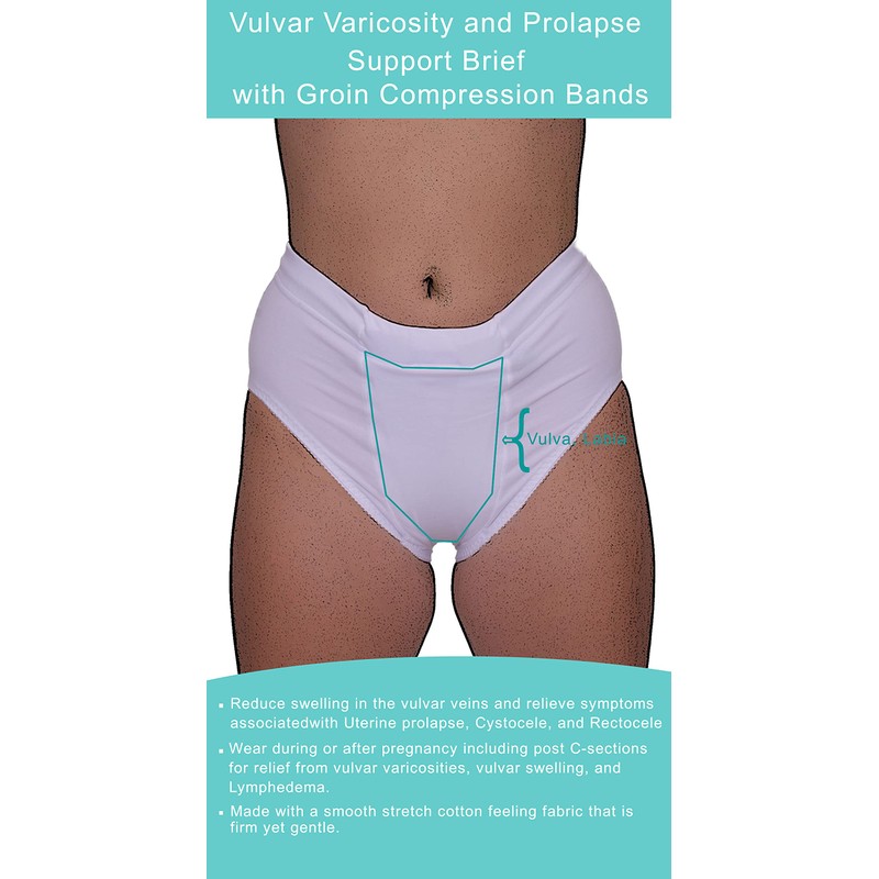 - Unique brief design with built in bands that provide support and compression to reduce swelling in the vulvar veins and to provide the needed support to the pelvic floor muscles to relieve symptoms associated with Uterine prolapse, Cystocele-bladder prolapse, and Rectocele. The beauty is in the design - these are regular briefs, just a panty, regular underwear that does all you need at less than half the price that many charge.