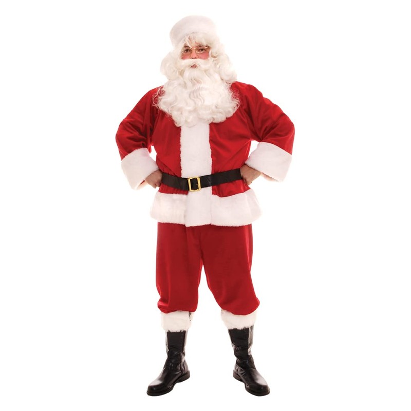 • Santa wig, beard, and glasses sold separately from this velvet Santa suit.