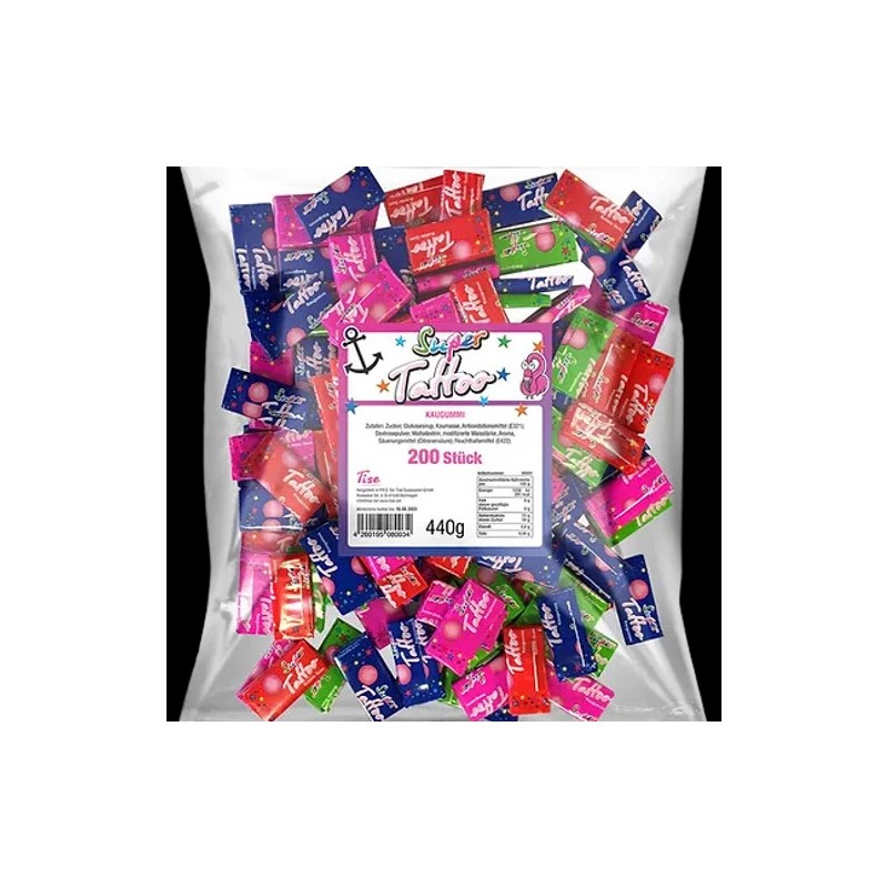 Super tattoo chewing gum, colorfully mixed, 200 pieces per bag, individually packaged (various colors)Super suitable as throwing material for carnival and Mardi Gras or to fill your pinata at a child's birthday party